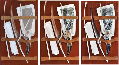 Het eerste deel bevat de Middelnederlandse tekst en is in Gotische stijl uitgevoerd. Het tweede deel is een door mij geschreven 'moderne’ bewerking (Er flitsten drie lichtstralen over de Maas…) in een ‘moderne’ stijl.